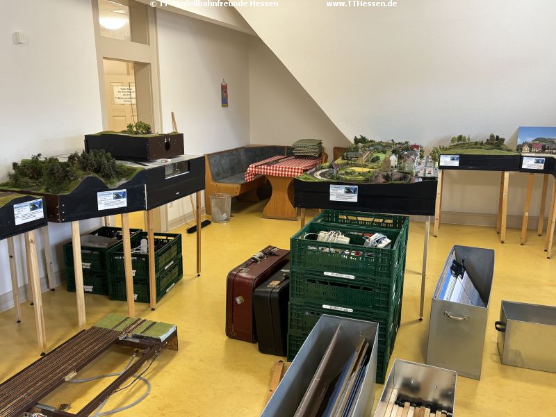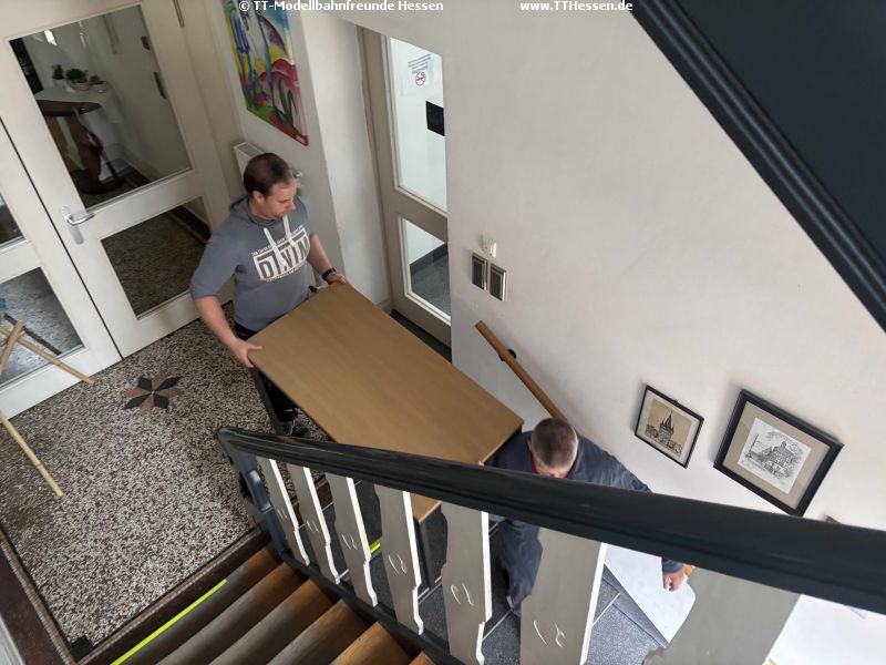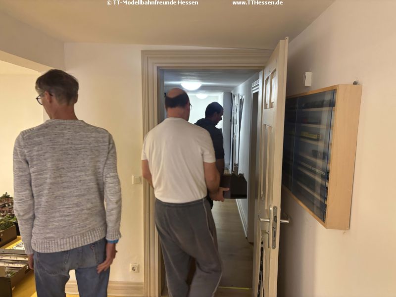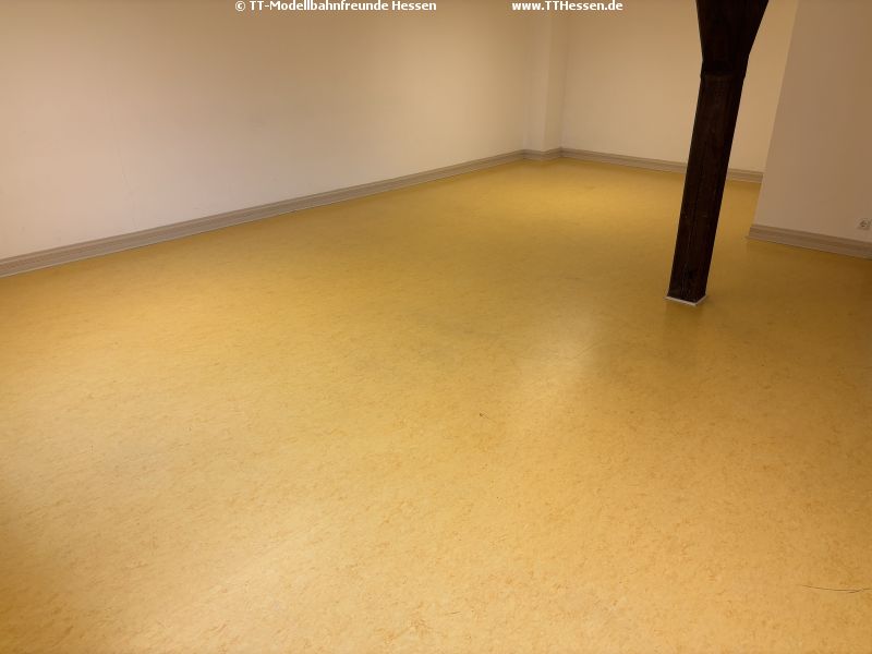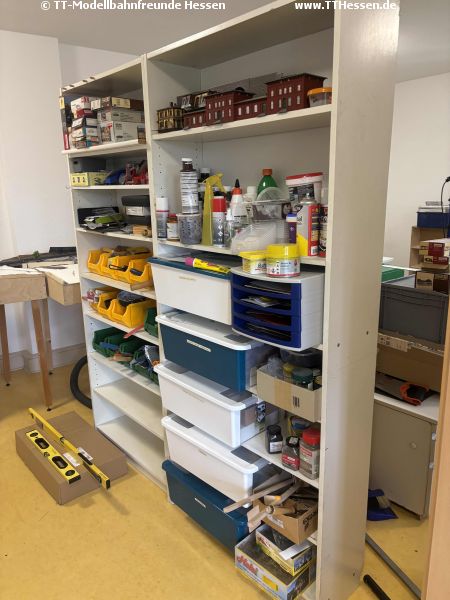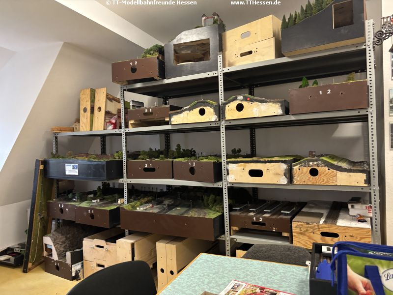 Alle nicht verbauten Module fanden ihren Platz in unserem großen Regal. So war unser alter Raum sehr schnell leer und nach kurzer Reinigung kann er nächste Woche der Stadt Neustadt zurückgegeben werden. Abschließend fand unser beleuchteter Aufsteller auch noch seinen Platz im Flur.
