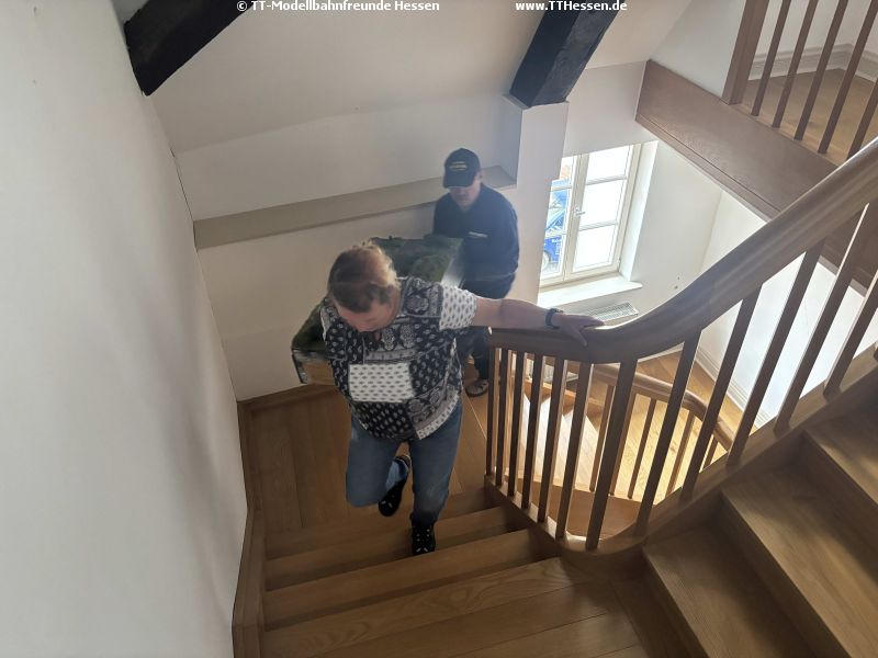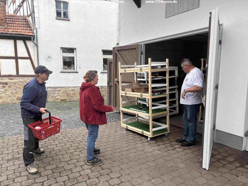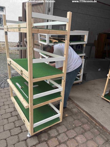 ImageImageAufgrund der vielen Helfer konnte Heiko die restlichen Transportgestelle auf die neue Höhe kürzen. Ralf brachte noch neue stärkere Rollen für unser Doppelgestell mit, denn die alten hielten die Belastung nicht aus.