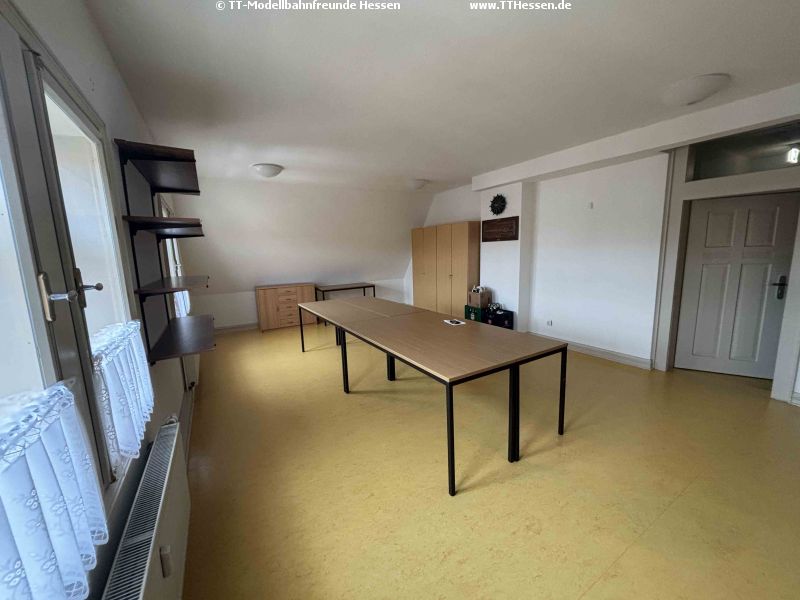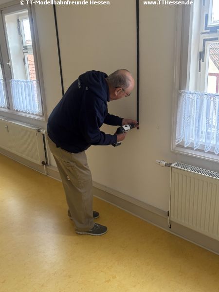 Unsere alten offenen Schränke werden durch neue Schränke ersetzt. (Bild 4) Doch bevor die Schränke ihren endgültigen Platz fanden wurden die Regalböden durch Klemens und Klaus unseren Bedürfnissen angepasst. (Bild 5 u. 6) Nach Eintreffen von Nils wurden die Tische verladen. (Bild 7) Gleichzeitig wurde unser Getränkevorrat aufgefüllt. (Bild 8) Aufgrund der vielen Helfer konnte Heiko die restlichen Transportgestelle auf die neue Höhe kürzen. (Bild 9) Ralf brachte noch neue stärkere Rollen für unser Doppelgestell mit, denn die alten hielten die Belastung nicht aus. (Bild 10) Nachdem alle Vorbereitungen abgeschlossen waren wurde begonnen die Module aus dem alten Raum in unseren neuen Ausstellungsraum zu bringen. (Bilder 11-16) Die für den Aufbau benötigten Module wurden gleich an ihrem Platz ausgelegt und so füllte sich der Raum sehr schnell. (Bild 17 u. 18) Im Anschluss wurden alle Module auf ihre Füße gestellt. (Bilder 19 u. 20) Die Kisten mit dem Zubehör wurden in der Mitte des Raumes zum späteren Aufbau abgestellt. (Bild 21) Zuletzt wurden noch die Schenkel der Eckbank umgebaut, so dass die Ecke optimal genutzt werden kann. (Bild 22) Alle nicht verbauten Module fanden ihren Platz in unserem großen Regal. (Bild 23) So war unser alter Raum sehr schnell leer und nach kurzer Reinigung kann er nächste Woche der Stadt Neustadt zurückgegeben werden. (Bild 24) Abschließend fand unser beleuchteter Aufsteller auch noch seinen Platz im Flur. (Bild 24)