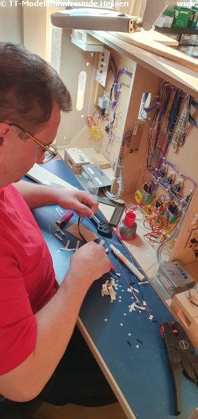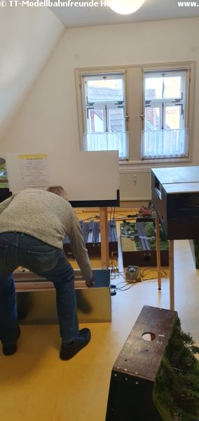 Allerdings konnte nicht wie geplant unser Bahnhof in die Modellanlage integriert werden. Während der Austellung hatten sich Probleme an Weichen, Signalen und einen "Stromlosabschnitt" herauskristalisiert. Diese Probleme und Defekte müssen erst behoben werden. Eigentlich wollte sich Edgar darum kümmern, war allerdings in die "Beratung" unseres Besuchs stark eingebunden.