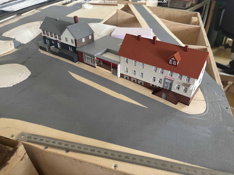 Am Neustadt-Modul sollten die Straßen zumindest provisorisch aufgebracht werden. H-G hat die bereits gespachtelte Straße geschliffen während Edgar den Verlauf der Straßen mit Klebeband darstellte.
