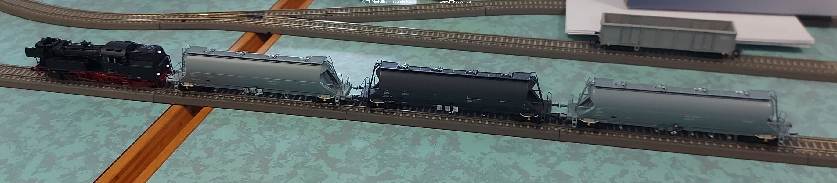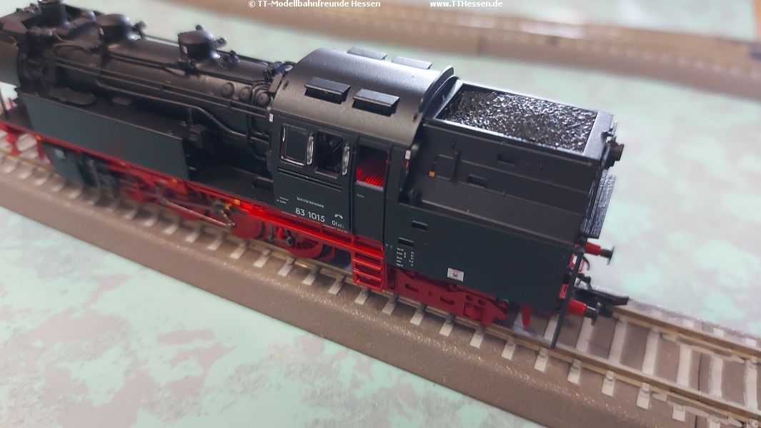 Beim heutigen Treffen wurden zunächst einige Errungenschaften vorgestellt. Auf dem Testkreis zu sehen war eine BR83 von Piko mit Sound, beleuchteter Feuerbüchse und Triebwerksbeleuchtung, die dann auch 3 Staubsilowagen zog.