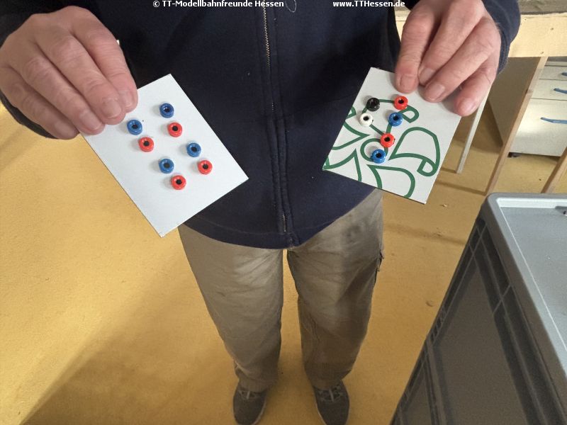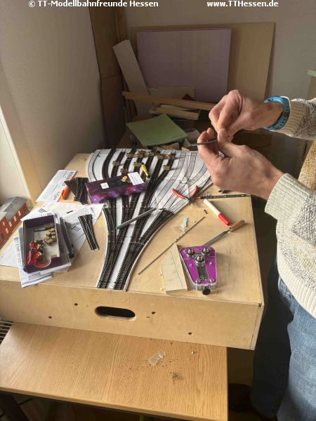 Mit Kaffee gestärkt ging es dann ans Arbeiten. Für unsere 8ten Neustädter Modellbahntage am 13. und 14.06.2026 ist der Aufbauplan im Groben bereits erstellt. Zum Einsatz sollen auch die 15, 30 und 45 Grad Module kommen. Da diese bisher nur im Rohbau existieren, hat Andreas zunächst die Anschlussplatinen hergestellt.