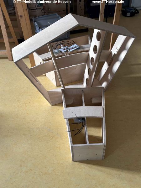 Klaus und Edgar brachten danach die Aufnahmen für die Absperrung an, so dass beim nächsten Mal die Trassenbretter für die Gleise gesetzt werden können.
