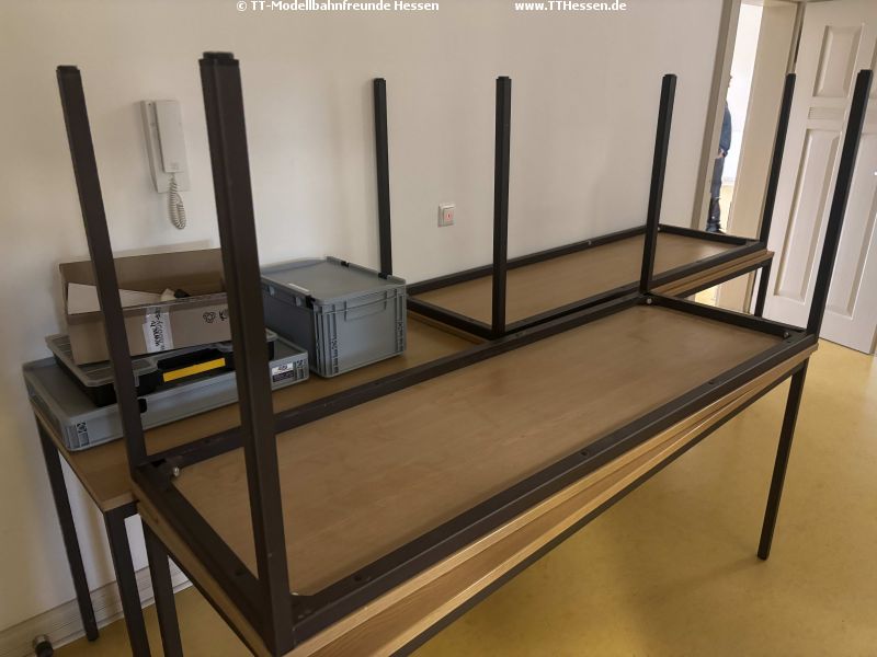 Unsere alten offenen Schränke werden durch neue Schränke ersetzt. (Bild 4) Doch bevor die Schränke ihren endgültigen Platz fanden wurden die Regalböden durch Klemens und Klaus unseren Bedürfnissen angepasst. (Bild 5 u. 6) Nach Eintreffen von Nils wurden die Tische verladen. (Bild 7) Gleichzeitig wurde unser Getränkevorrat aufgefüllt. (Bild 8) Aufgrund der vielen Helfer konnte Heiko die restlichen Transportgestelle auf die neue Höhe kürzen. (Bild 9) Ralf brachte noch neue stärkere Rollen für unser Doppelgestell mit, denn die alten hielten die Belastung nicht aus. (Bild 10) Nachdem alle Vorbereitungen abgeschlossen waren wurde begonnen die Module aus dem alten Raum in unseren neuen Ausstellungsraum zu bringen. (Bilder 11-16) Die für den Aufbau benötigten Module wurden gleich an ihrem Platz ausgelegt und so füllte sich der Raum sehr schnell. (Bild 17 u. 18) Im Anschluss wurden alle Module auf ihre Füße gestellt. (Bilder 19 u. 20) Die Kisten mit dem Zubehör wurden in der Mitte des Raumes zum späteren Aufbau abgestellt. (Bild 21) Zuletzt wurden noch die Schenkel der Eckbank umgebaut, so dass die Ecke optimal genutzt werden kann. (Bild 22) Alle nicht verbauten Module fanden ihren Platz in unserem großen Regal. (Bild 23) So war unser alter Raum sehr schnell leer und nach kurzer Reinigung kann er nächste Woche der Stadt Neustadt zurückgegeben werden. (Bild 24) Abschließend fand unser beleuchteter Aufsteller auch noch seinen Platz im Flur. (Bild 24)