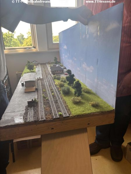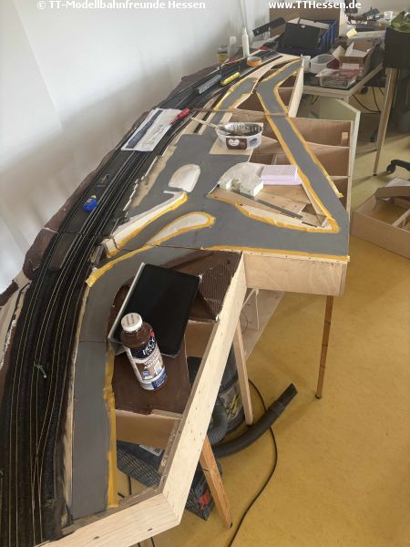 ImageImageAm Neustadt-Modul sollten die Straßen zumindest provisorisch aufgebracht werden. H-G hat die bereits gespachtelte Straße geschliffen während Edgar den Verlauf der Straßen mit Klebeband darstellte.