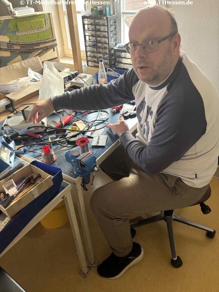 Mit Kaffee gestärkt ging es dann ans Arbeiten. Für unsere 8ten Neustädter Modellbahntage am 13. und 14.06.2026 ist der Aufbauplan im Groben bereits erstellt. Zum Einsatz sollen auch die 15, 30 und 45 Grad Module kommen. Da diese bisher nur im Rohbau existieren, hat Andreas zunächst die Anschlussplatinen hergestellt.