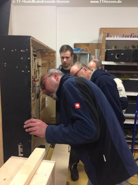 Die lange Zeit ohne Modellbahn über Weihnachten und Silvester ist vorbei und voller Tatendrang wurde heute an allen Ecken zugeschnitten, gesägt, gebaut, gelötet und auch gefahren. Doch auch über die Feiertage hat sich einiges getan. Nils und Harald trafen sich vor Weihnachten und nahmen sich unser Sorgenkind Drehscheibe vor. Beim ersten Einsatz im Rahmen unserer 3ten Neustädter Modellbahntage stellte sich heraus, dass die Drehscheibe nicht sauber eingebaut wurde und der Rahmen des Moduls nicht steif genug war. Deshalb mussten alle Gleise wieder gelöst, die Drehscheibe neu justiert, Gleisanschlüsse erneuert und eine Strebe zur Verstärkung unter dem Modul angebracht werden.