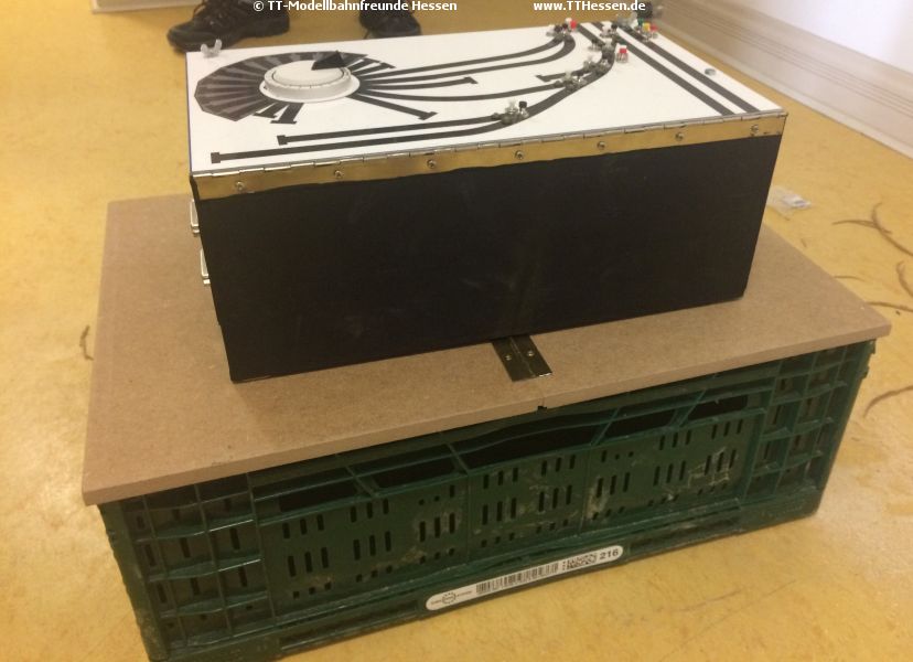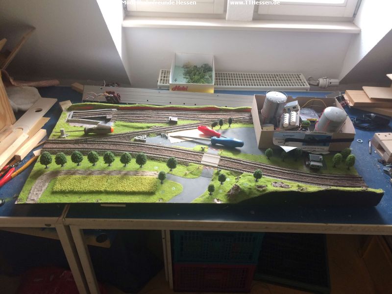Andy entfernte vom nächsten Modul des Tanklagers den Unterbau. Dieser wird komplett neu aufgebaut. Anschließend stellte er uns zwei Entwürfe vor, wie die Gleisgeometrie aussehen könnte. Beim ersten liegt der Schwerpunkt auf dem Rangieren und beim zweiten Entwurf steht die Abstellung im Vordergrund.