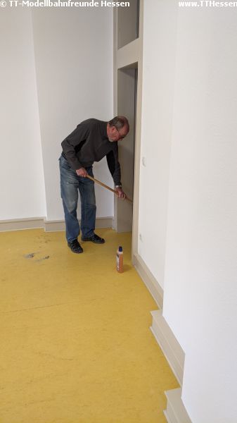 Nachdem unsere Module vom zweiten in den ersten Stock umgezogen sind, galt es, den ehemaligen Modulraum wieder hübsch zu machen. In den vergangenen Tagen haben unter anderem Nils und Klaus schon viel in dieser Beziehung geleistet, so dass heute nur noch Restarbeiten zu leisten waren. Ein kleiner Teil der Wände musste noch fertig gestrichen werden, die Fenster geputzt und der Boden gereinigt werden.