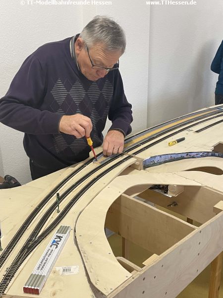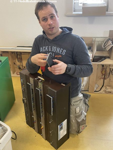 Danach baute er alle Module ohne Oberleitungsmasten aus um Platz für den Bahnhof zu schaffen. Nach unserer Kaffeepause wurden alle Module nach oben getragen und gemeinsam mit Maritta wurde die Anlage wieder fahrfähig gemacht