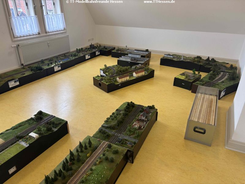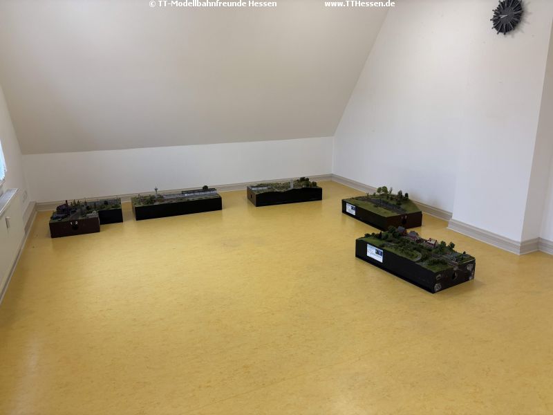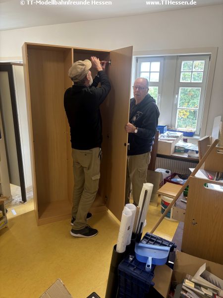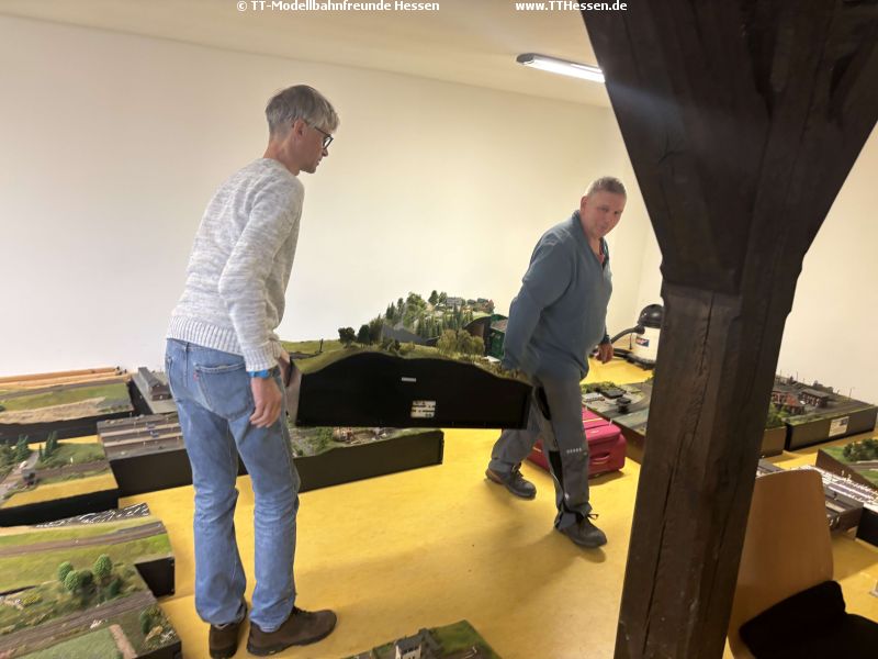 Alle nicht verbauten Module fanden ihren Platz in unserem großen Regal. So war unser alter Raum sehr schnell leer und nach kurzer Reinigung kann er nächste Woche der Stadt Neustadt zurückgegeben werden. Abschließend fand unser beleuchteter Aufsteller auch noch seinen Platz im Flur.